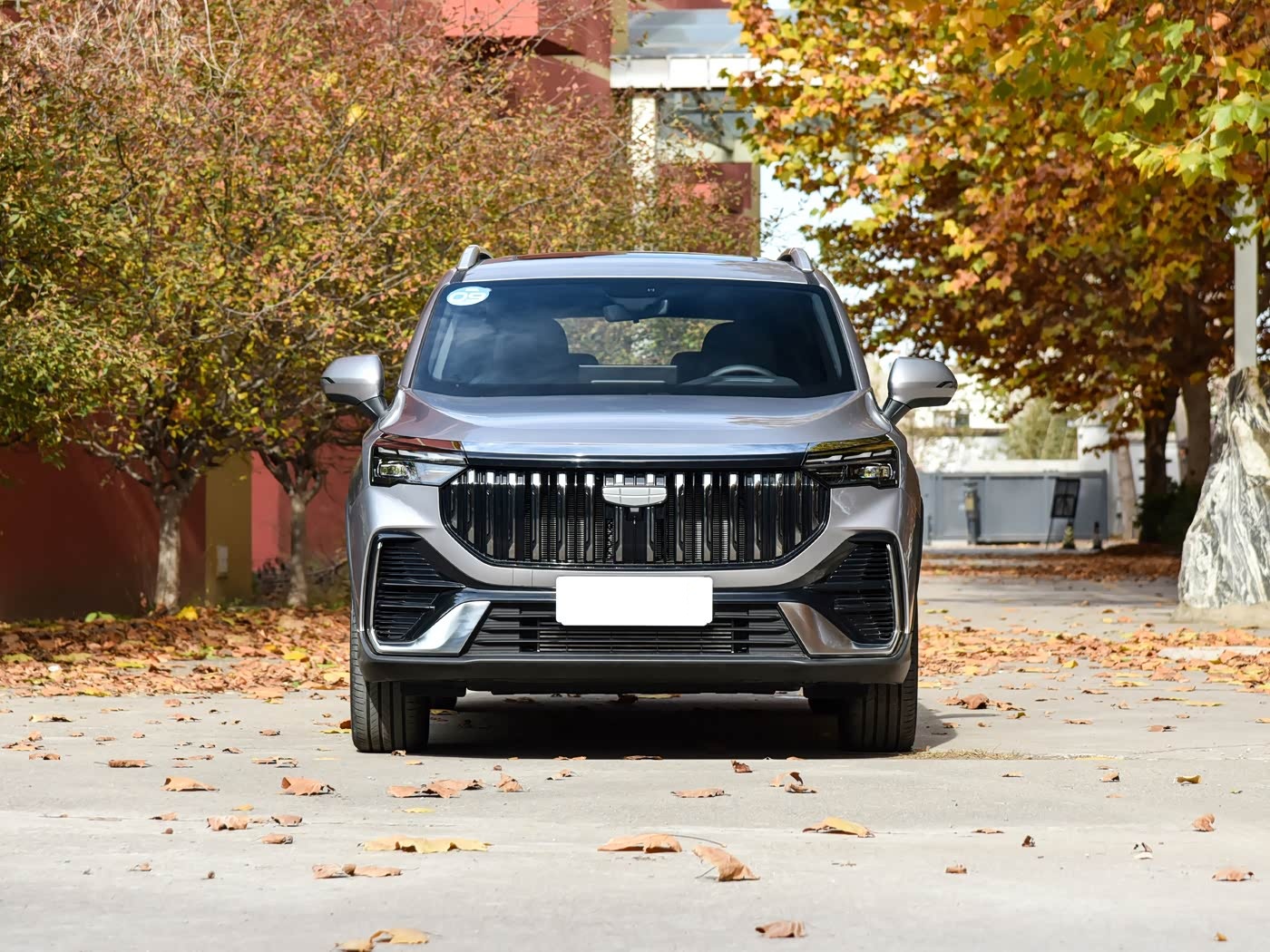 我们首先来看新车的外观设计方面,豪越L的车头造型采用了吉利家族最新的设计语言,整体风格霸气十足,充满力量感。前脸部分,大尺寸的进气格栅内部采用直瀑式镀铬饰条装饰,搭配两侧造型犀利的大灯组,营造出一种强烈的视觉冲击力。大灯组内部结构精致,配备了LED光源,照明效果出色,在夜间行驶时能够提供良好的视野。前保险杠的设计也十分动感,两侧的导流槽不仅提升了车头的运动气息,还有助于降低风阻。底部的银色护板则为整车增添了一份野性,彰显出豪越L作为一款中型SUV的硬朗气质。