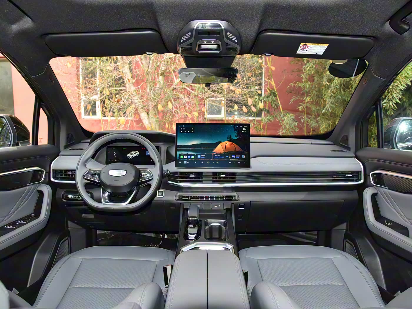 进入车内,座舱以 “云端全景” 为设计理念,60 英寸四季流转全景天窗搭配高坐姿设计,白天采光充足,夜晚可陪孩子观星。内饰提供暖阳棕与月影灰两种配色,分别取自桂林日落与祁连月色,接触面大面积采用软质搪塑包裹,缝线工艺工整,但门板下方硬塑料材质稍显遗憾。智能化方面,10.2 英寸仪表 + 14.6 英寸中控屏搭载银河 OS 2.0 系统,支持 HUAWEI HiCar 互联与三指飞屏,第二排座椅支持前后调节和靠背角度调节,乘客可以根据自己的需求调整到最舒适的坐姿。第三排座椅的空间也较为宽敞,成年人乘坐也不会感到过于拥挤。