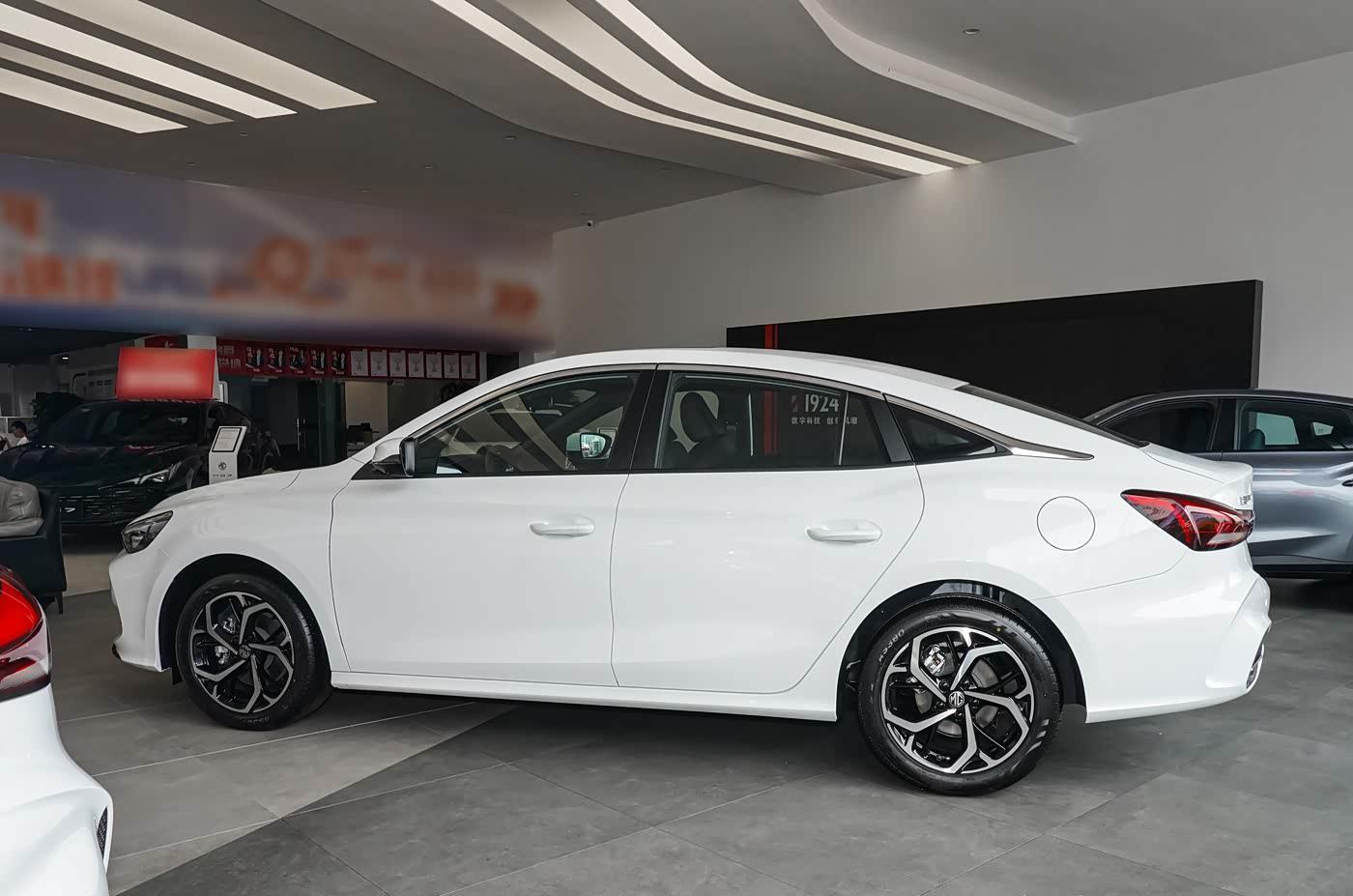 再来看车身侧面部分,车身侧面是MG5最吸睛的部分。Fastback溜背造型从B柱开始流畅下压,风阻系数优化明显,在降低风噪的同时提升了高速稳定性。双腰线设计是点睛之笔,上部腰线贯穿门把手,下部线条向上扬起,形成蓄势待发的运动姿态。车身尺寸为4715/1842/1473毫米,轴距2680毫米,,属于同级主流水平。但通过优化座椅布局,后排腿部空间仍能轻松容纳三名成年人,头部空间也未因溜背造型而牺牲太多。此外,全车超过20处储物空间设计,包括门板杯架扩容至1.5L容量,中央扶手箱内置空调出风口,实用性大幅提升。