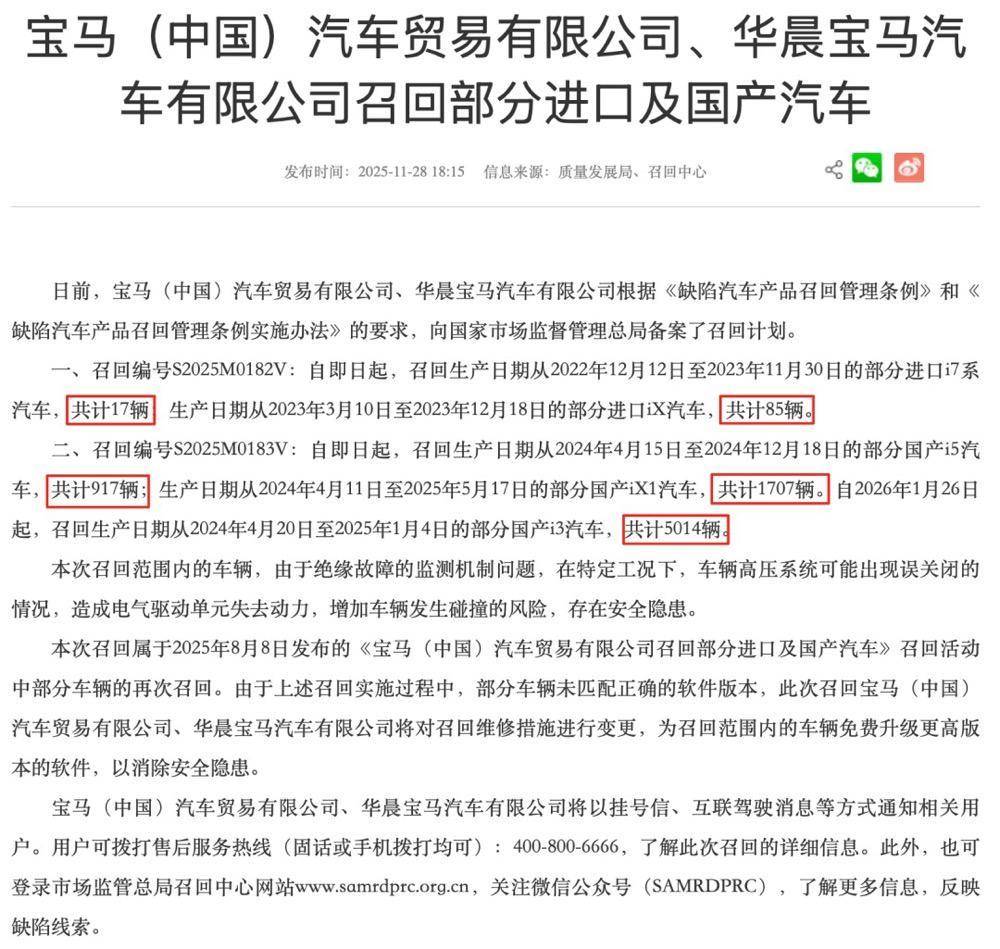 说完了国产新能源,合资的当然也有,比如宝马召回的i5、iX3、i3三款车型,合计7638辆,不过宝马新能源的销量基数太小,基本上是宝马新能源是全部涉及到了。