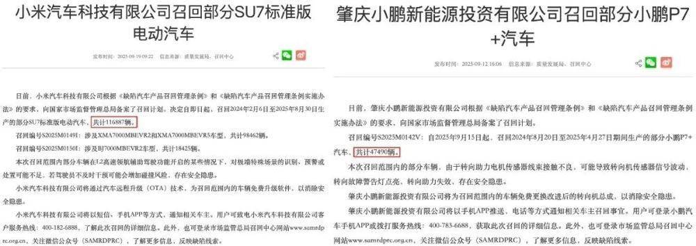 而除了比亚迪以外,小鹏汽车因转向助力电机传感器线束接触不良,召回47490辆小鹏P7+,而且另外一家小字辈的小米汽车,因辅助驾驶存在安全隐患,召回116887辆小米SU7标准版。