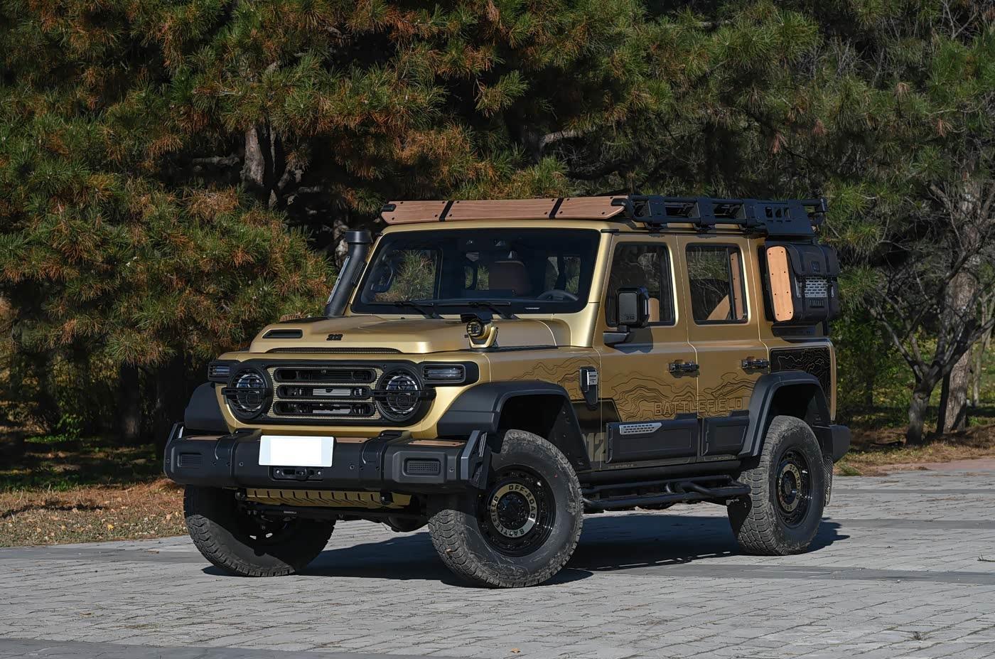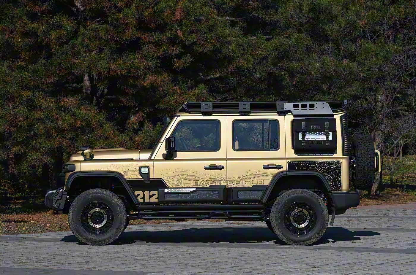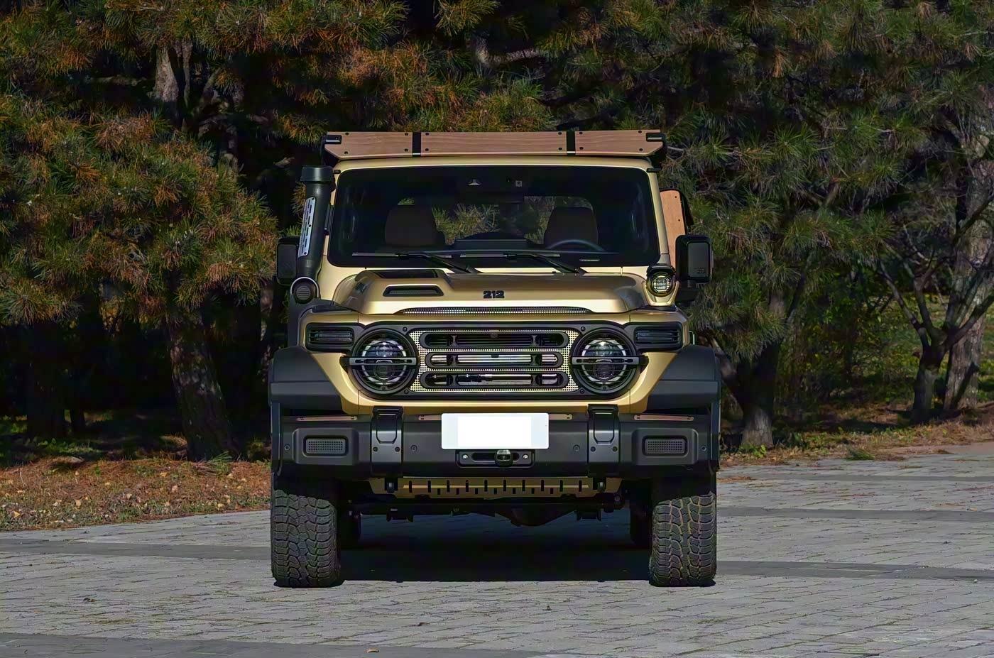 我们首先来看新车的外观设计方面,T01高地版的车头设计堪称“武装到牙齿”。前脸采用经典的“一拱、二圆、三横、四纵”设计语言,圆形大灯与贯穿式LED日行灯的组合,既保留了老款212的复古韵味,又增添了现代科技感。前保险杠采用仿木纹枪托设计,搭配金属防撞梁,不仅提升了视觉冲击力,还能有效保护车身免受碎石撞击。最引人注目的是涉水喉设计,其造型灵感源自迫击炮,不仅增强了涉水能力(深度达910mm),还配备了军士铭牌风格的涉水深度标识,细节处尽显硬核气质。 此外,前杠两侧的射灯采用防爆网造型,既能防石防撞,又为夜间越野提供了充足照明。