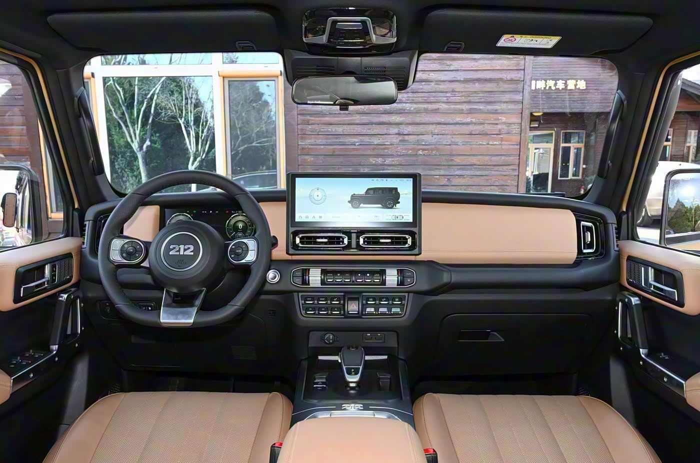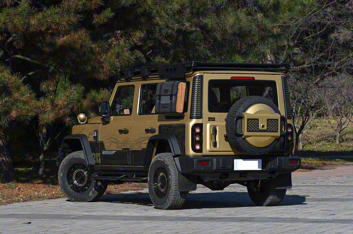 再来看车尾部分,车尾设计延续了212家族的经典风格,外挂备胎与侧裙饰板的组合,既保留了硬派越野的粗犷感,又通过细节优化提升了现代感。尾灯采用深邃设计风格,搭配造型独特的排气管,整体布局与车头遥相呼应。后保险杠同样采用仿木纹枪托设计,与前杠形成统一风格。值得一提的是,后备箱开口高度经过优化,方便取放物品,同时保留了212标志性的侧开式尾门设计,致敬经典的同时提升了实用性。