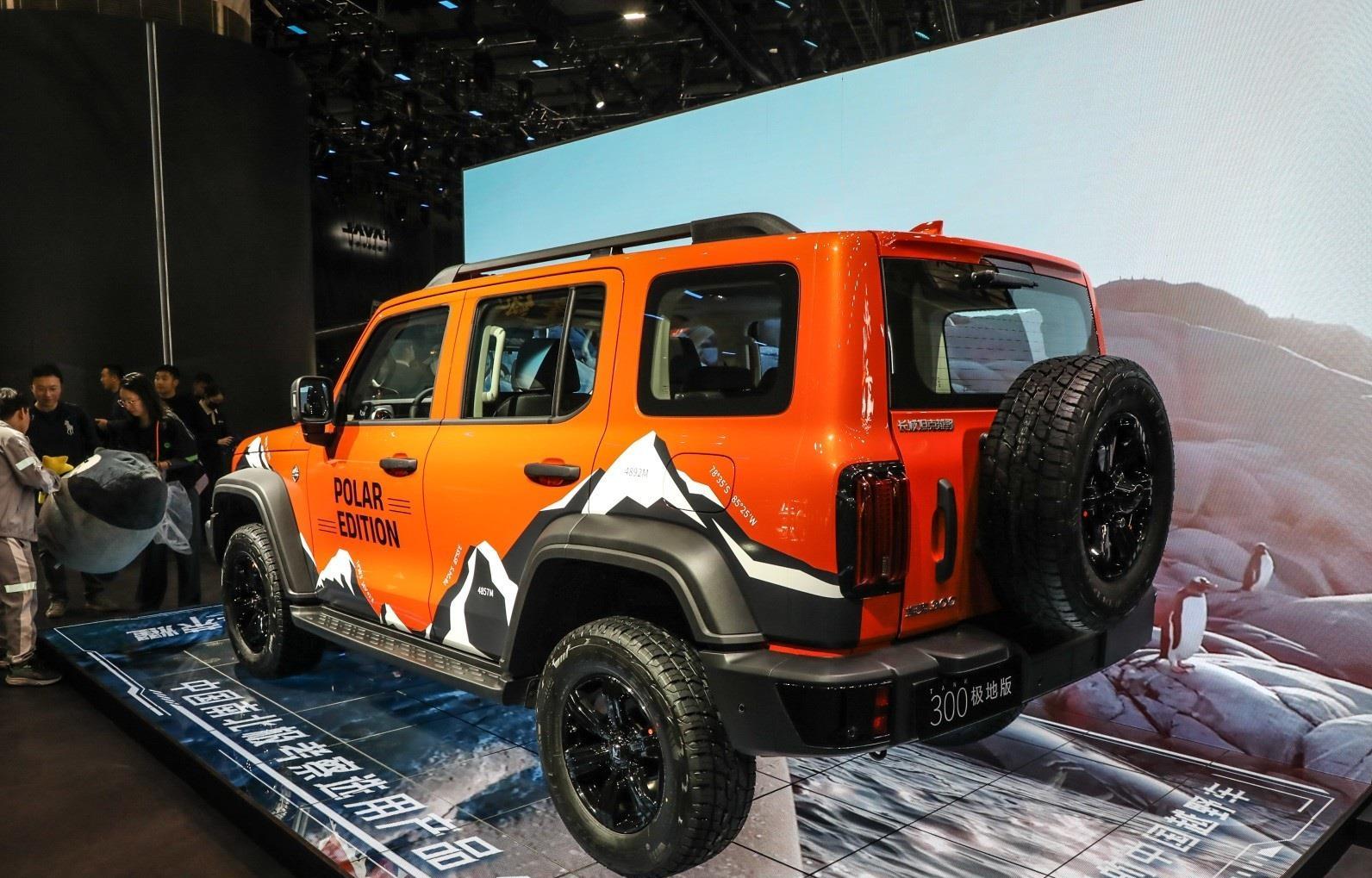 再来看车身侧面部分,车身侧面延续坦克 300 经典的方盒子造型,平直硬朗的线条搭配宽体轮拱,营造出强烈的力量感。专属 “极地橙” 车身色选用国际通用安全色,既在冰雪环境中形成鲜明视觉标识,又承载 “心想事橙” 的美好寓意,搭配 “极地锋芒” 拉花(以南北极山脉为灵感),辨识度拉满。全系标配 AT 全地形越野轮胎,深花纹设计大幅提升冰雪路面抓地力,配合 17 英寸防脱轮毂,有效防止低温环境下轮胎脱圈。车门下方配备加厚越野侧踏,既方便上下车,又能抵御岩石剐蹭,而车门密封系统经过极地化优化,增强隔音隔热效果。