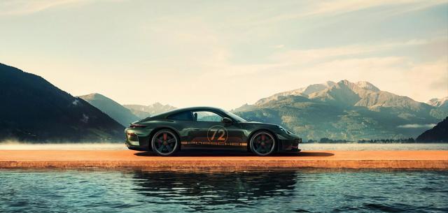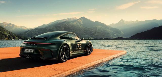 车身侧面依然是双门溜背式造型,线条感比较干练,分段式的腰线点缀出了车身侧面的层次感,隐藏式的门把手能够起到降低风阻的作用,线条感比较圆润,轮毂采用了黑色Sport Classic风格,而且配备有中央锁止轮圈盖,同时配备有1963年版保时捷徽章,同时还有专属的拉花加持。