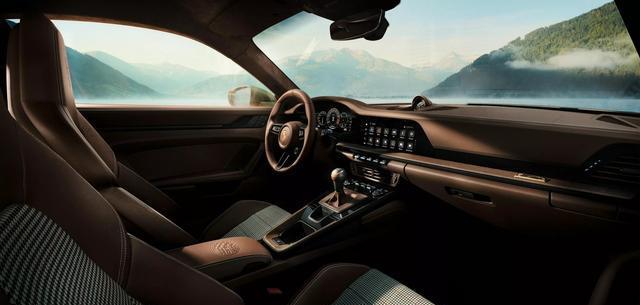 内饰方面,整体布局也没有变化,提供有三幅式平底多功能方向盘、全液晶仪表盘、内嵌式中控屏以及球头挡把,内饰内饰采用网格编织,座椅采用松露棕皮革与织物混搭材质,质感比较出色。而且车辆仪表台镶嵌的金色铭牌刻有初代911轮廓剪影、F.A.保时捷的亲笔签名以及限量90台的字样,彰显了独特的身份,而且随车附赠Porsche Design限量特别版Chronograph I腕表和旅行包。