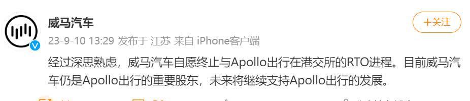 2023年9月,威马官方宣布终止与一家名为Apollo出行的公司的借壳上市计划。