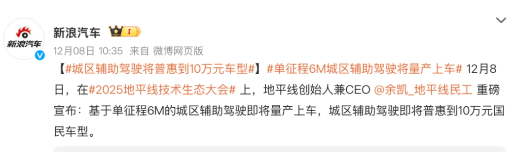 12月8日,在地平线技术生态大会上,地平线创始人兼CEO余凯放出豪言,把城区NOA这一高阶辅助驾驶能力,推向了成本敏感、利润紧缩的入门市场;这意味着地平线基于单颗征程6M芯片的城区辅助驾驶方案,即将在10万元级的国民车型上实现前装量产。