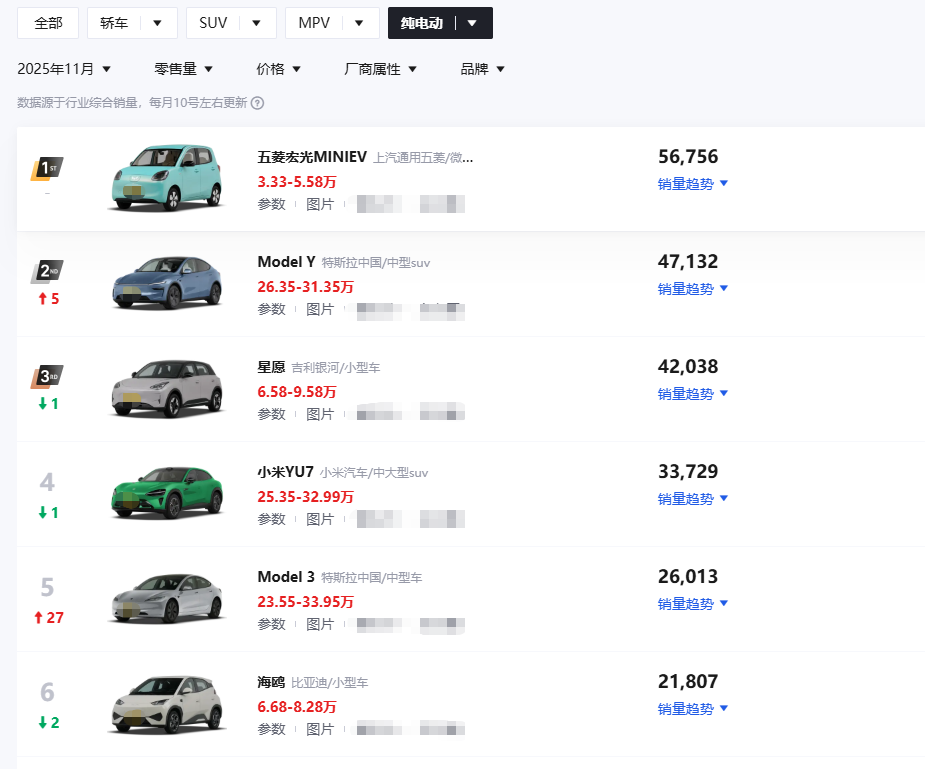 今年11月份的纯电动车销量榜已经出炉,纵观榜单前50,大家会发现一个再明显不过的特点,那就是,除了特斯拉19年上市的Model Y和今年25年1月上市的Model 3以外,前五十的榜单里面,已经几乎全是我国自主品牌的电车在竞争国内‘封神榜’了。合资车中,只有日系车日产N7与丰田的铂智3X还努力吊着车尾,勉力维持着合资车的存在感。