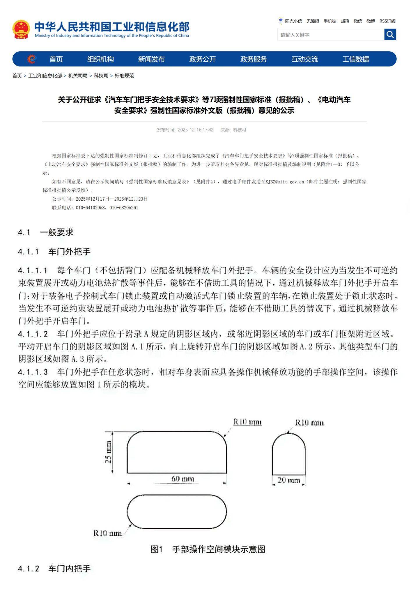 工信部出手调整《汽车车门把手安全技术要求》,本质上是倒逼行业回归“安全第一”的初心,从“炫技”走向“务实”,从某种程度上来说,这项新规或能够引导企业规范车门内外把手产品设计,从而提升门把手的安全性能以及整体车辆的安全水平。依据工信部信息,目前《汽车车门把手安全技术要求》等7项强制性国家标准(报批稿)仍然处于公示阶段,会到2027年1月1日才开始实施,调整期限仍有一年的缓冲时间。2027 年起,全隐藏式把手的退出,不仅是政策对消费者生命安全的守护,更标志着汽车行业从 “形式化设计” 向 “务实安全” 的理性转向 —— 毕竟在紧急时刻,“能打开门” 才是最基础的安全底线。