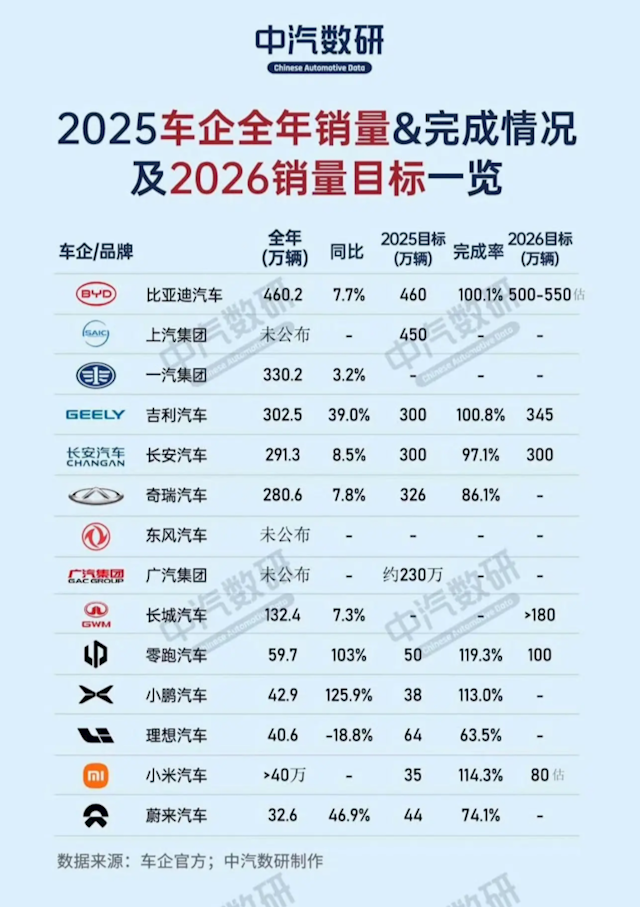 根据中汽数研公布的部分车企2025年销量目标完成率来看,国内只有比亚迪、吉利、零跑、小鹏、小米等车企率先达标。长安汽车接近达标,其余车企中,还有年度完成率仅在7成左右。