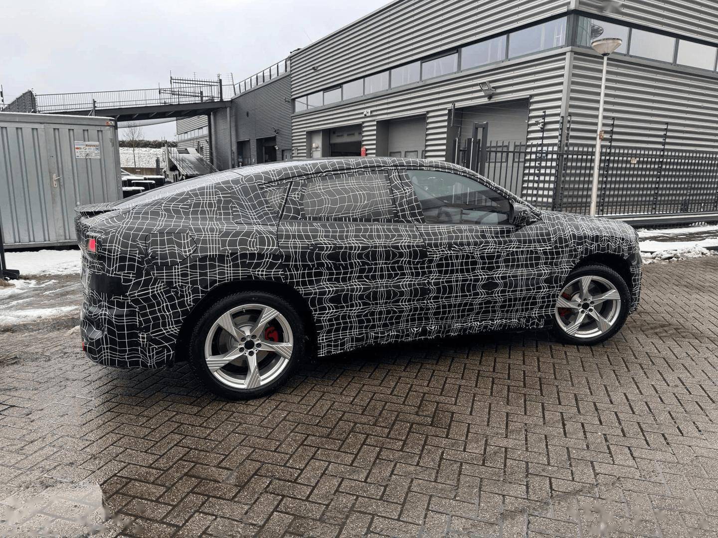 车头部分延续了iX3的家族化语言,但自B柱起造型发生显著变化:车顶线条以更陡峭的角度向后倾斜,车窗面积随之收窄,营造出典型的轿跑SUV比例。车尾设计突破传统,尾门扰流板内嵌横向开口,与宝马现有车型形成差异化。测试车配备的全新双色轮圈与齐平式门把手(源自iX3)进一步凸显科技感。