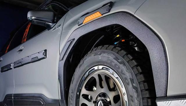 可以看到,该车还升级了定制化的放脱圈轮毂,并且搭配了来自东洋的R/T轮胎,从而提升非铺装路面的抓地力。