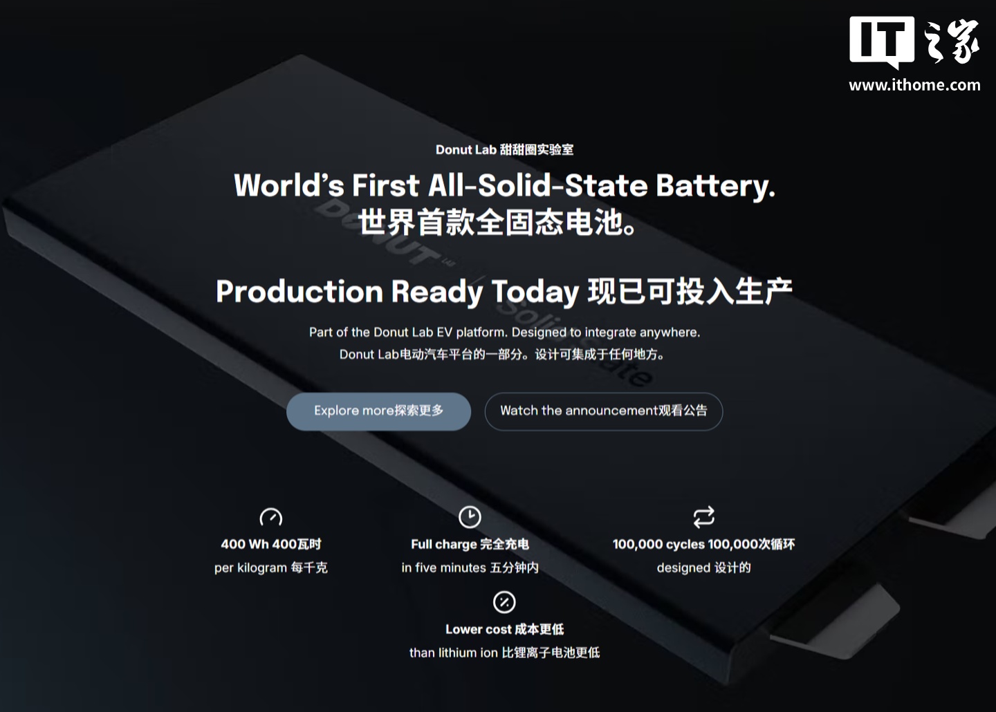 IT之家 1 月 5 日消息,Donut Lab 公司宣传,其全球首款可商业化、具备量产条件的全固态电池正式问世,这款电池有望彻底变革电动汽车行业 —— 从乘用车、摩托车,到重型卡车与工程机械设备,无一例外。