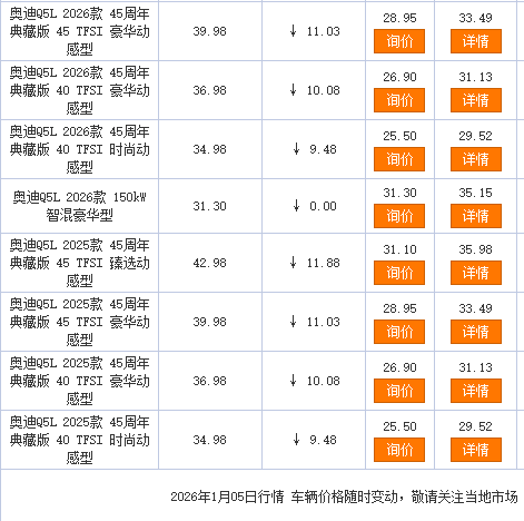 此次降价并非单纯促销,核心是清库换代与政策叠加的双重驱动。2026款车型已上市,2025款库存车让利力度拉满,部分地区叠加置换补贴后,45TFSI臻选动感型优惠后仅30.9万,较指导价直降超12万。更有24期0利率、至高3万置换补贴等福利,降低购车门槛。