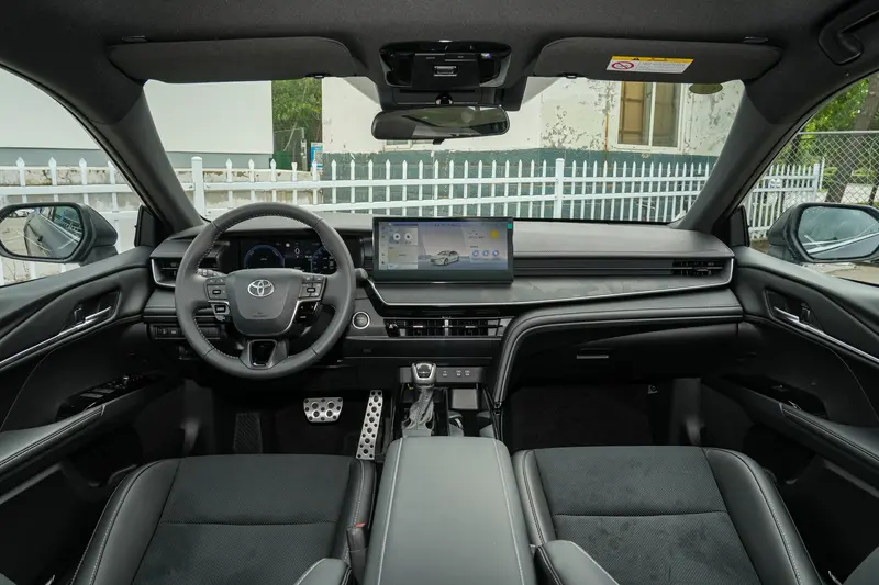 内饰方面,新车依旧延续现款在售车型的整体内饰设计,层次感丰富的中控台造型搭配悬浮式液晶仪表,虽说整体的科技感营造不如当下主流新能源车型那般强烈,但是笔者个人还是相对欣赏新车这套内饰设计,首先相比老款凯美瑞,整体的科技感以及高级感提升非常明显,更主要的是,在保证车内功能的前提下,没有新能源车那般同质化,其实这份原创度还是值得推荐的。