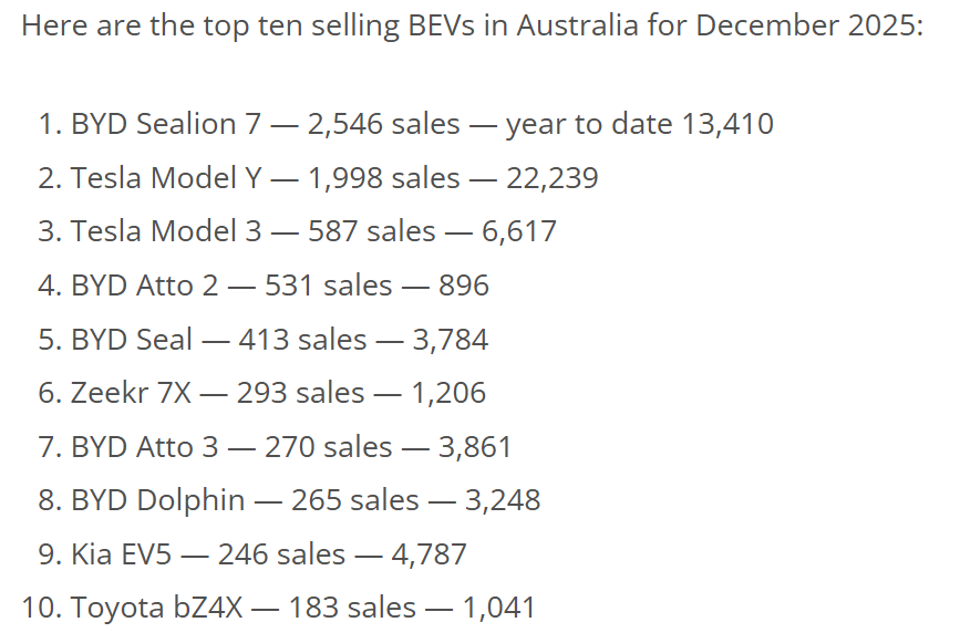 在电动汽车销量排名方面,比亚迪品牌表现强劲。其新推出的Atto 2车型于2025年11月上市后即排名第六,12月又迅速攀升至第四位。按整个品牌销量来看,比亚迪全年销量同比增长超150%,位列澳大利亚年度销量前十榜单第八位。
