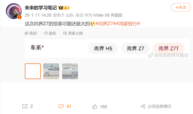 快科技1月12日消息,博主“未来的学习笔记”发文表示鸿蒙智行尚界Z7新车“惊喜可能还挺大”,据博主分享的图片显示,该车型将涵盖Z7、Z7T两个版本。