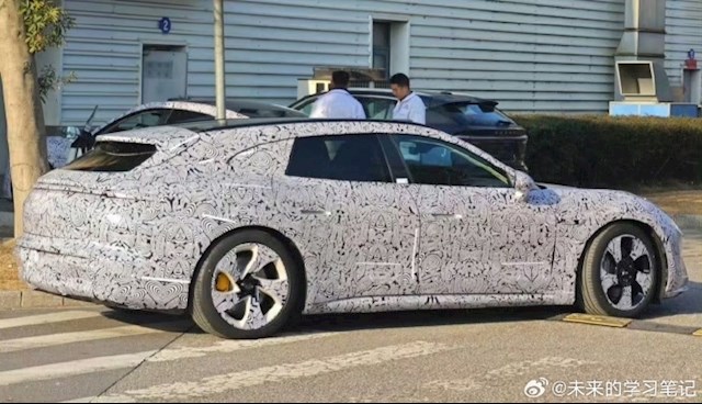 新车侧面呈修长的旅行轿跑造型,车顶线条从B柱后溜向车尾,侧窗舒展且后排为隐私玻璃,隐藏式门把手简化视觉,车门处有轻微腰线起伏,整体轮廓流畅,细节被伪装遮挡,风格兼顾动感与空间感。