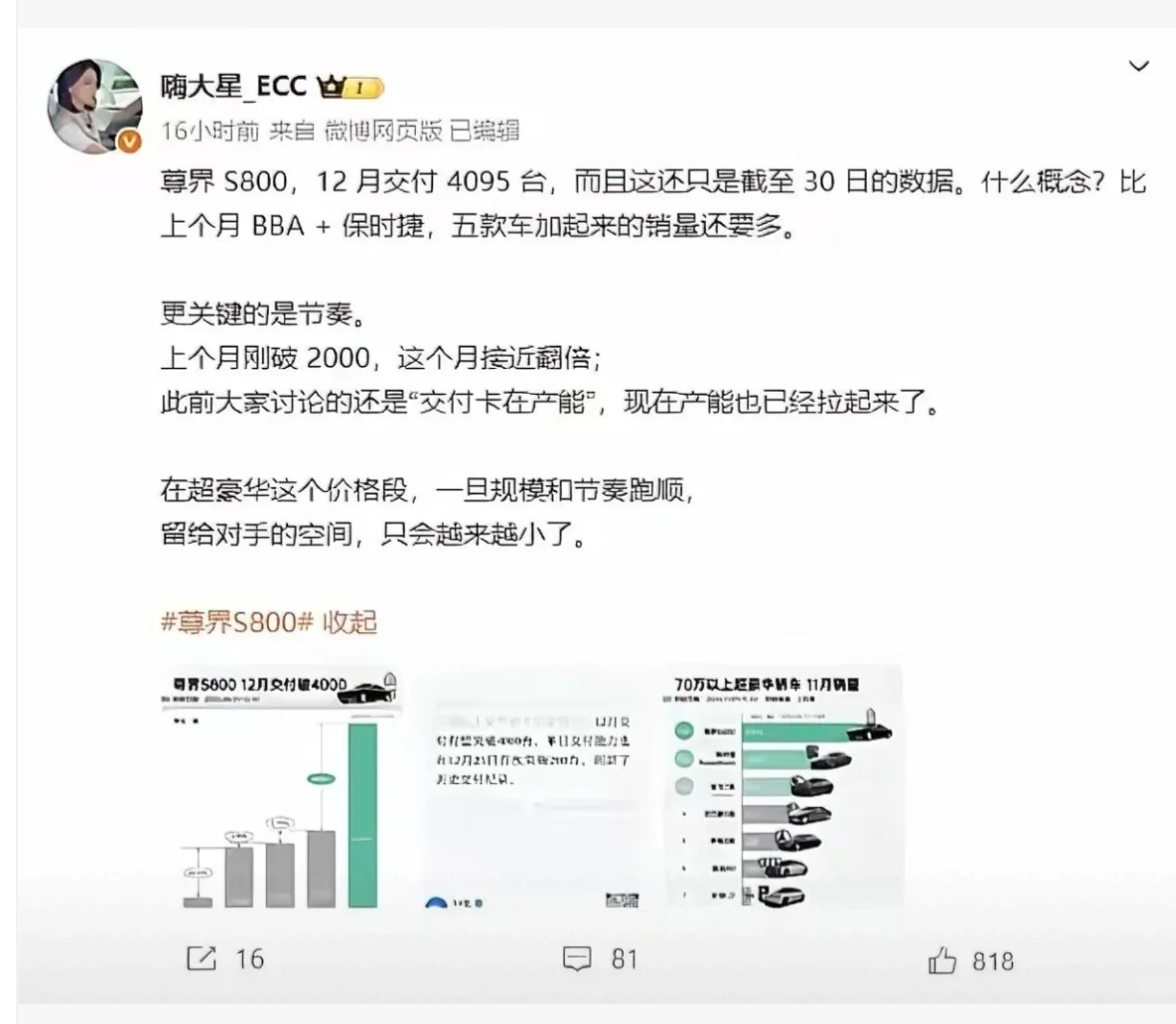 “国产百万豪车不行”“就是堆配置没技术”——在尊界S800的争议声中,一组销量数据直接让质疑者闭了嘴:12月交付4095台,这个数字不仅比上月直接翻倍,更狠狠超越了同期BBA+保时捷五款超豪华车型的销量总和。曾经被某些人喷得“一无是处”的尊界S800,用实打实的交付成绩证明:国产超豪华的崛起,早已不是“昙花一现”,而是势不可挡的市场趋势。