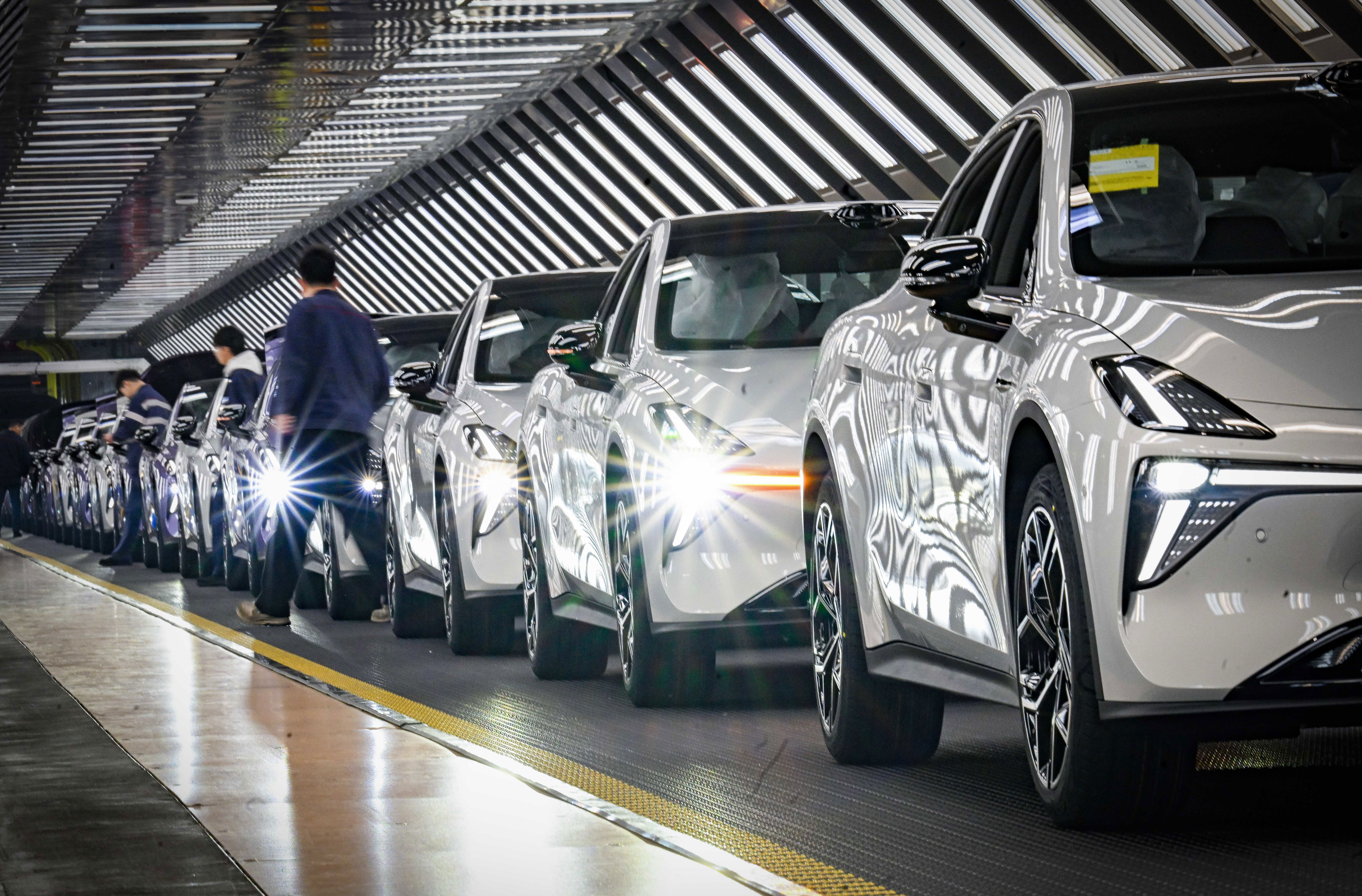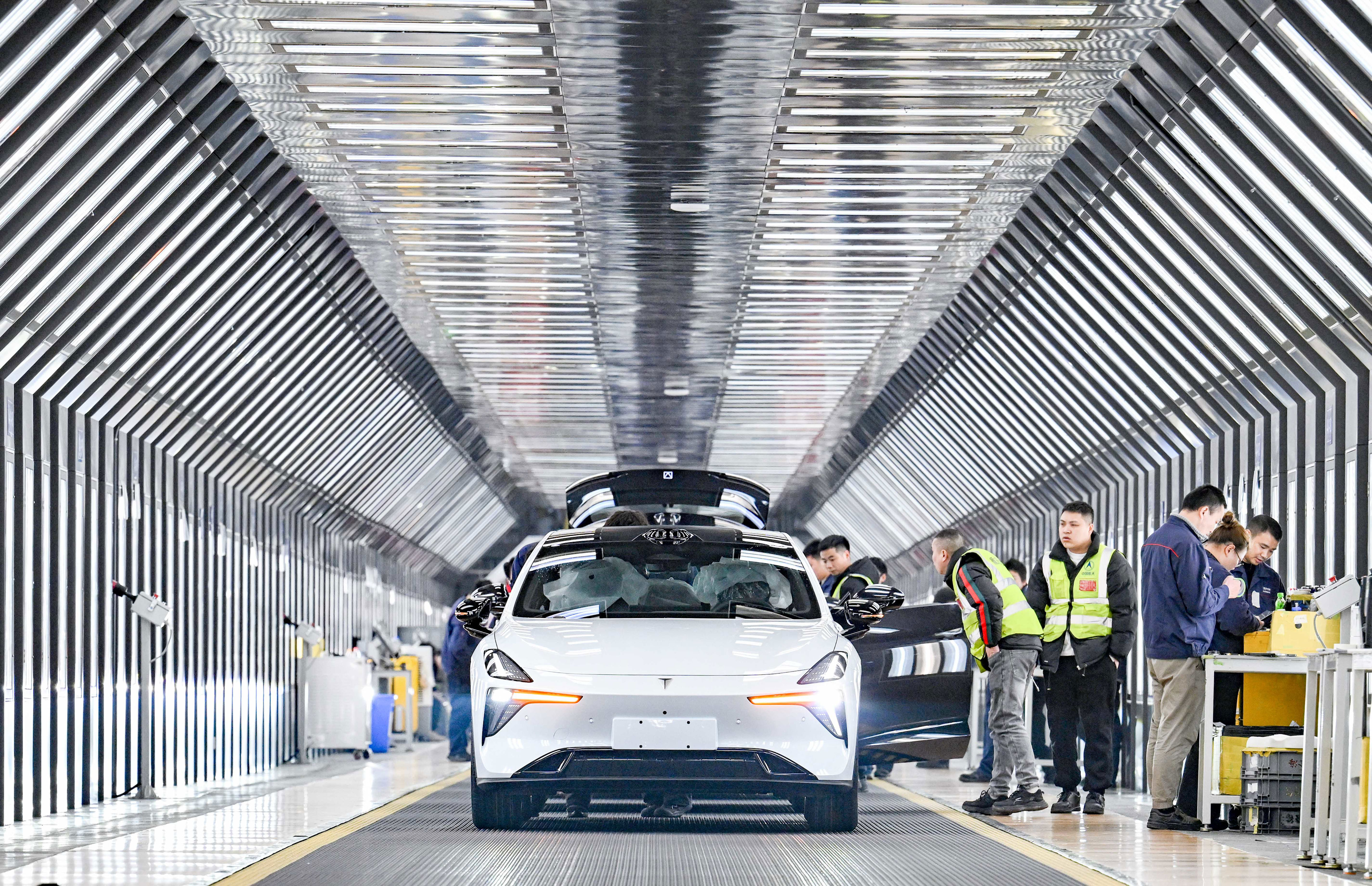 ▲1月26日,位于两江新区的长安阿维塔数智工厂,工人在灯棚检测线上对车身漆面质量等进行检查。