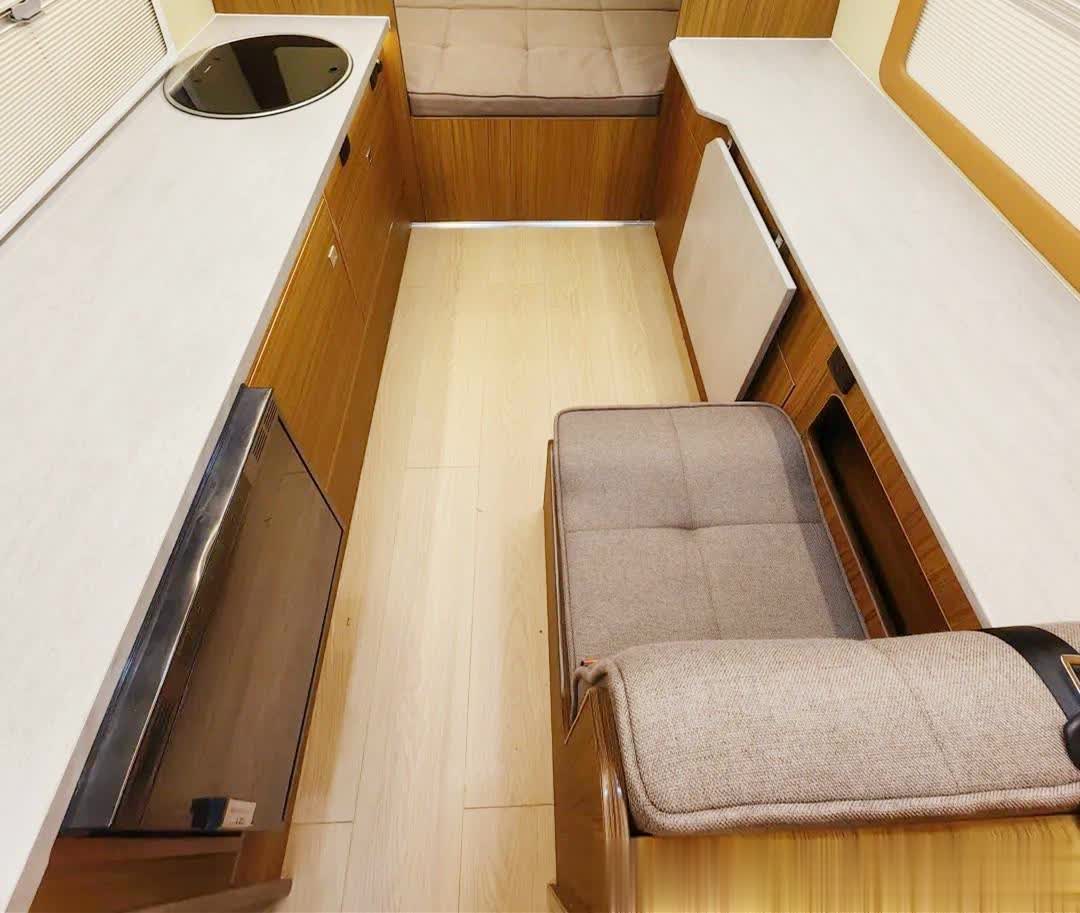 这台考斯特房车内饰布局并不常见但很有特色,首先它并非前后通透式布局,隐私性非常好。驾驶舱与后部生活区设计有隔断,可通过一扇小门进入,并采用前置卫浴间的设计,生活区整体性强。客厅两侧打造有多功能柜子,储物空间非常丰富。且一侧的柜子可拓展,配有内嵌式车载冰箱、不锈钢水槽,中部是通道,活动空间大,且只配了一张沙发座椅(带三点式安全带),加上主副驾座椅该车共核载3人。