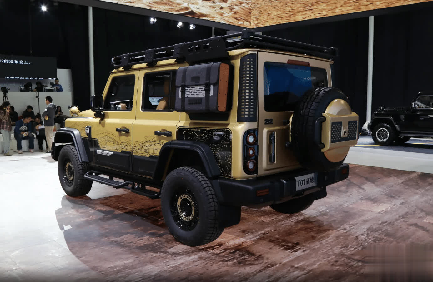 看车身侧面确实有不少的专业越野套件,包括上下车踏板以及车顶行李架都是高强度管件,原厂状态下已经是重型防脱圈轮毂搭配了at越野轮胎。再加上尾部专业改造的高强度备胎架,能够感觉到这款车就是为那些专业级别的越野老炮而准备,看起来并不是花架子,而是针对性和专业性很强的。