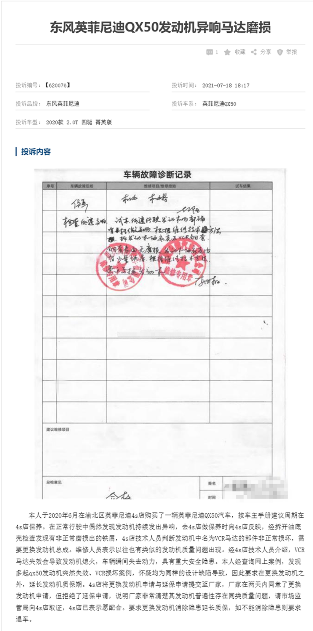 虽说官方否认国内存在同款缺陷,但从某汽车质量投诉平台的数据来看,国内QX50的发动机相关投诉也确实存在。有车主反馈,车辆出现发动机怠速异响、加速时异响明显、故障灯反复亮起、VCR可变压缩比模块频繁失效等问题,还有车主在质保期内就遇到发动机严重磨损,4S店直接要求更换发动机总成,这些故障征兆,和北美问题发动机的早期表现高度吻合,并非个例,也让官方的“无缺陷”说法,很难让国内车主真正信服。