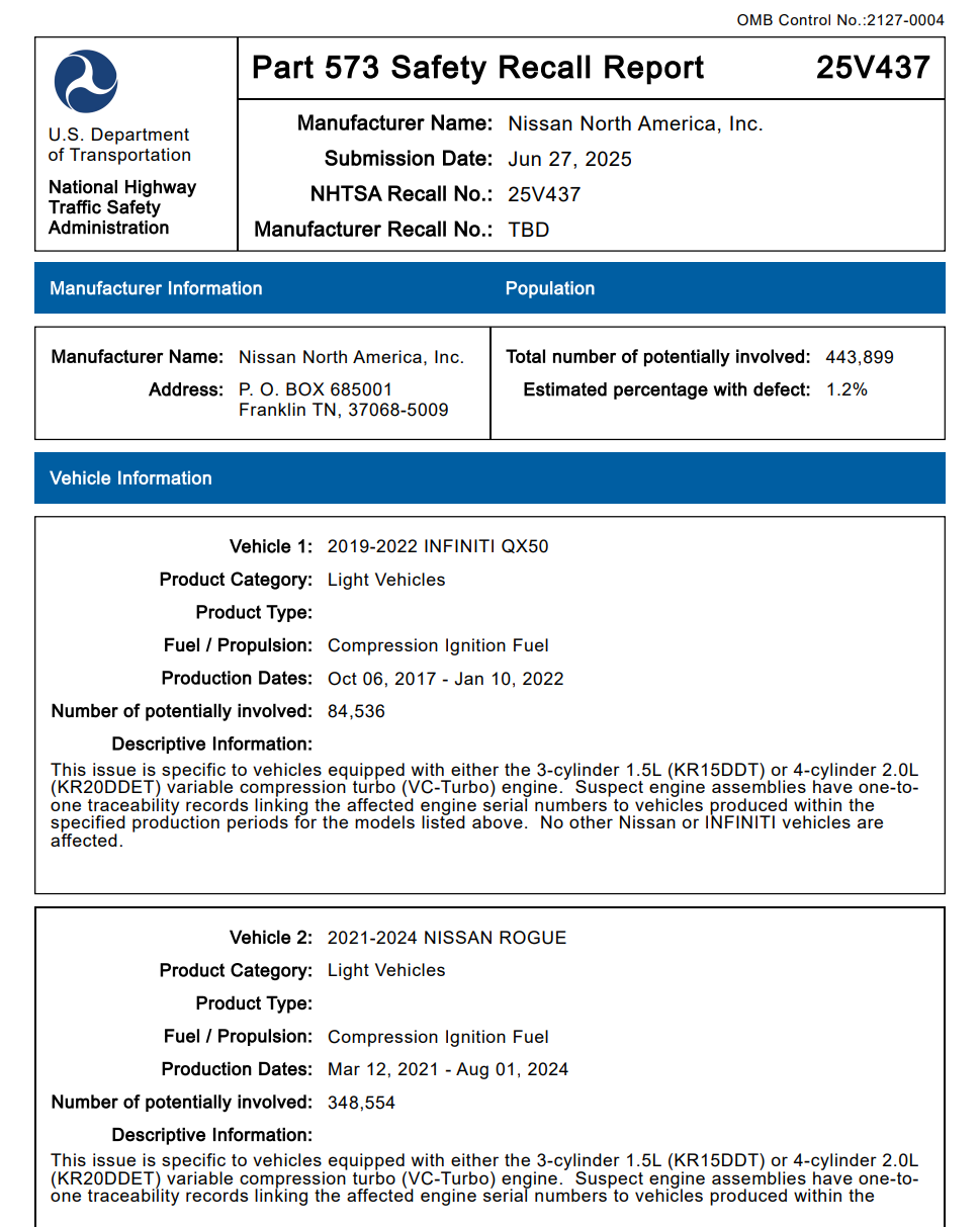 这场召回风波并非小范围整改,而是北美官方牵头的大规模安全行动。2025年7月3日,日产北美正式向美国公路安全管理局(NHTSA)提交召回申请(编号25V-437),首批涉及车辆就达到443899辆,覆盖英菲尼迪2019-2022款QX50、2022款QX55,以及日产多款同源车型,后续还因同类隐患追加了召回规模,足以见得问题绝非小毛病,而是实打实的安全隐患。