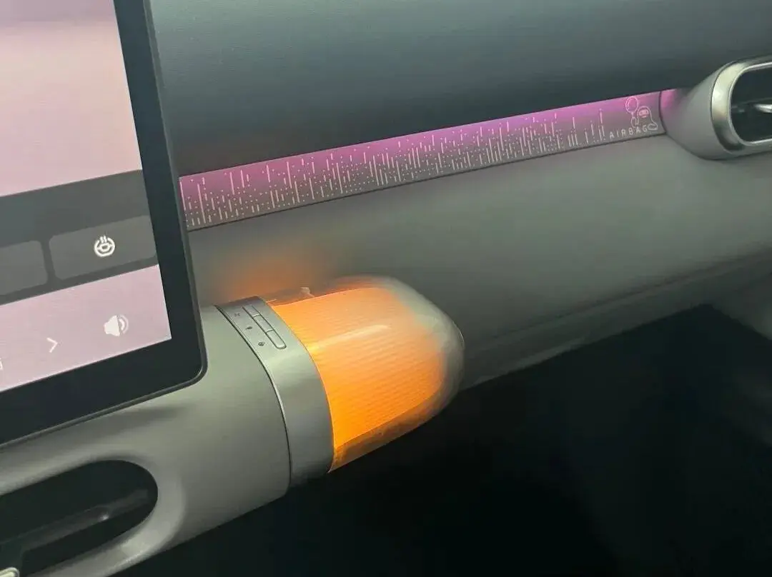 中控屏下面做了个悬浮IP BAR,说白了就是一个DIY功能区,可以选择氛围灯香氛/安全锤/加湿器等等,随你DIY。