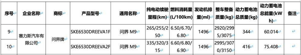 动力上,无论是增程版还是纯电版,前后电机的功率均得到提升。尤其值得注意的是,新款问界M9增程版车型还申报了最高达335km的纯电续航里程(250km、255km、265km、315km、320km和335km),这一数据较现款有了质的飞跃,也几乎达到了部分纯电车型的水平,预计将极大缓解用户的“充电焦虑”。