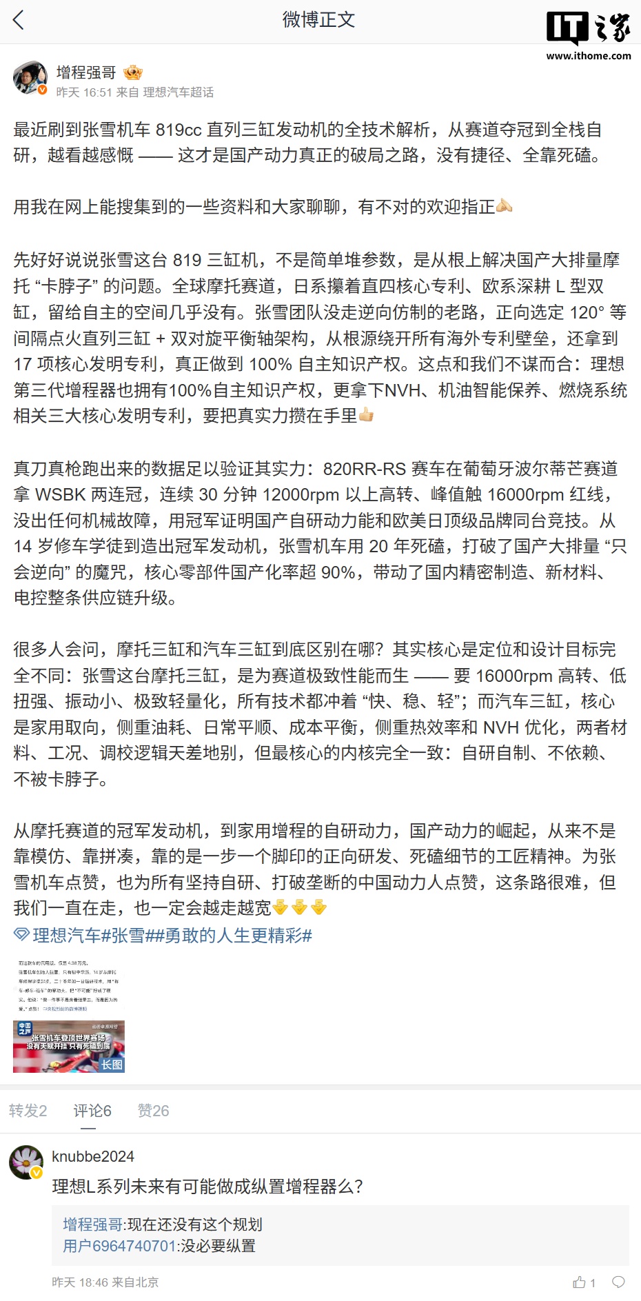 理想汽车增程系统负责人 @增程强哥 4 月 6 日发文,表示张雪这台 819 三缸机不是简单堆参数,是从根上解决国产大排量摩托“卡脖子”的问题。