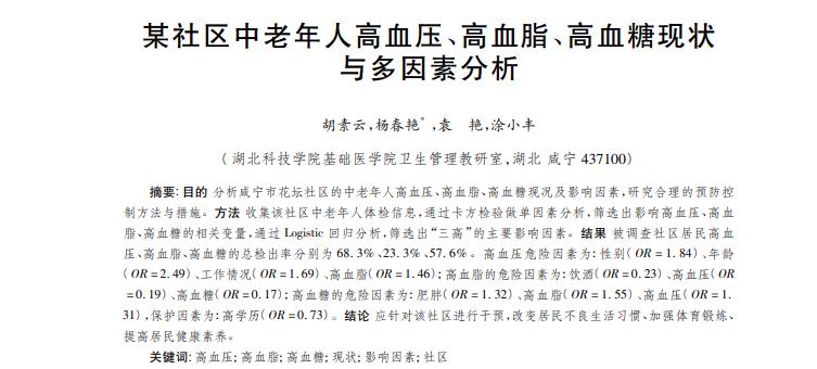 [1] 胡素云.某社区中老年人高血压、高血脂、高血糖现状与多因素分析,湖北科技学院学报(医学版),2021-08-15.