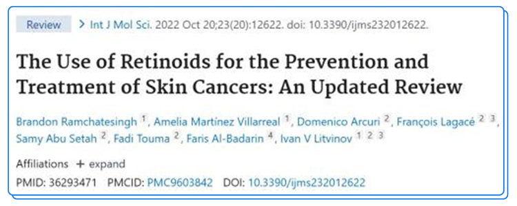 [3]Brandon Ramchatesingh ,Amelia Martinez Villarreal,Domenico Arcuri ,Francois Lagace, Samy Abu Setah ,Fadi Touma ,Faris Al-Badarin,Ivan V Litvinov.The Use of Retinoids for the Prevention and Treatment of Skin Cancers: An Updated Review.Int J Mol Sci.2022 Oct20;23(20):12622. doi:10.3390/ijms232012622.