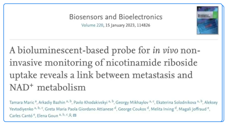 [2]Maric T, Bazhin A, Khodakivskyi P, Mikhaylov G, Solodnikova E, Yevtodiyenko A, Giordano Attianese GMP, Coukos G, Irving M, Joffraud M, Cantó C, Goun E. A bioluminescent-based probe for in vivo non-invasive monitoring of nicotinamide riboside uptake reveals a link between metastasis and NAD+ metabolism. Biosens Bioelectron. 2022 Oct 29;220:114826. doi: 10.1016/j.bios.2022.114826. Epub ahead of print. PMID: 36371959.