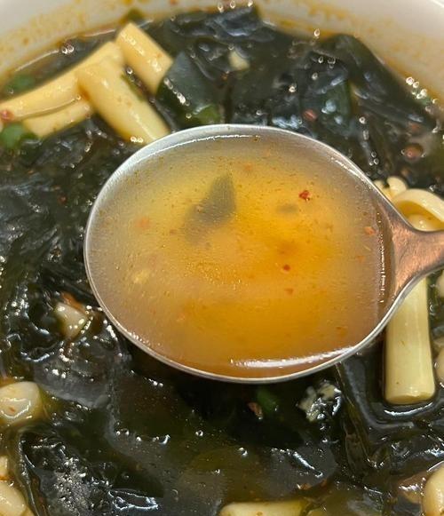 5. 放入泡好的裙带菜,搅散后煮1分钟(裙带菜易熟,别煮久),淋入打散的鸡蛋液(边倒边搅,形成蛋花),最后加小半勺盐、几滴香油调味,搅匀就关火。