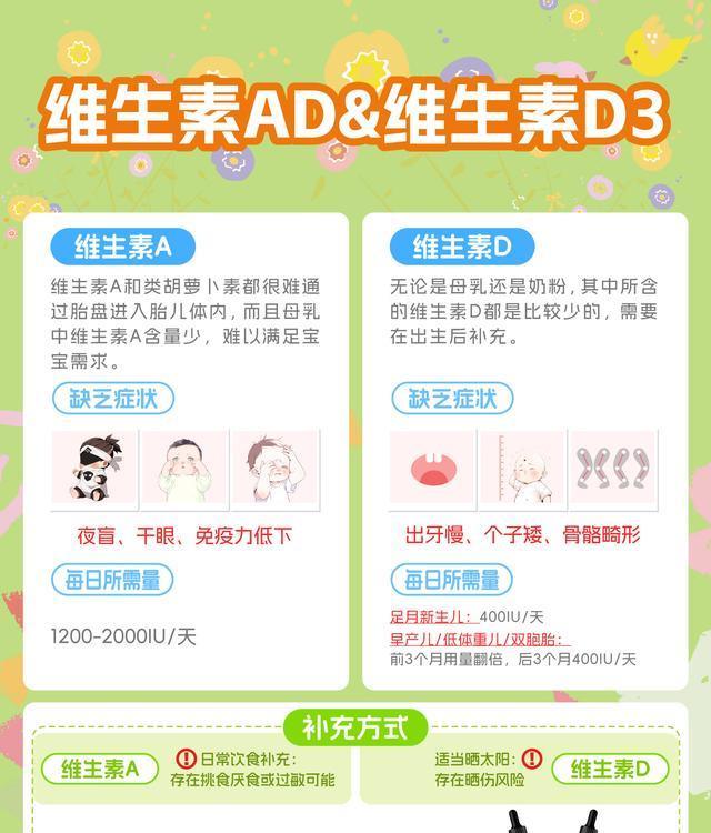 宝宝很难从母体中获得维生素A和维生素D,出生后建议及时通过补剂满足日常所需。