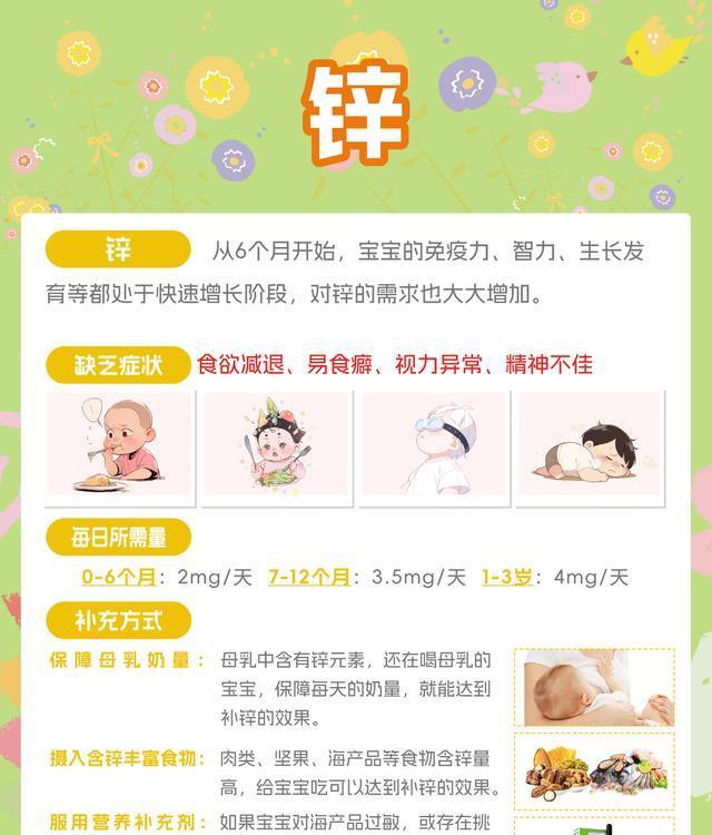 锌的建议补充剂量:0-6个月: 2mg/天;7-12个月: 3.5mg/天;1-3岁: 4mg/天