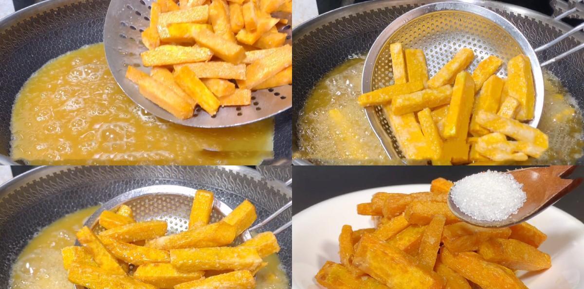 6、如果想吃更加酥脆一点的,就将油温升高,然后再放进去复炸 炸到焦黄酥脆,然后再给盛出 撒入白糖 或者是蘸着番茄酱吃,特别的美味好吃的。