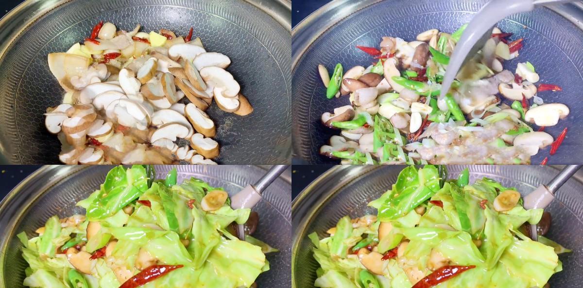 7、锅中再次烧油 放入五花肉改炒一炒,小火慢炒,煸炒出里面的油脂 ,然后再放入葱姜蒜爆香,然后再放入香菇片继续炒,炒入味 再放入炒好的包菜 再倒入弄好的料汁