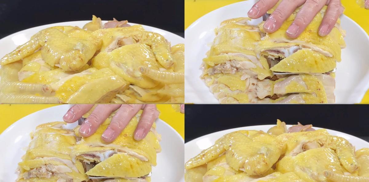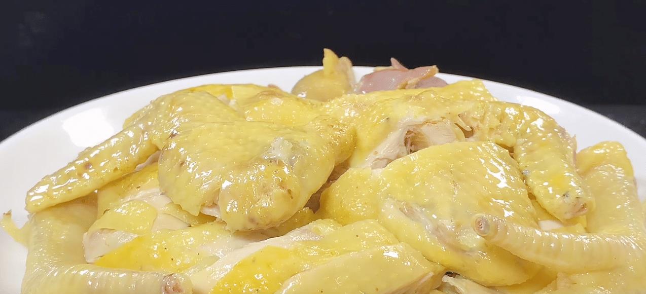 6、取出煮熟的鸡肉,先给剁成鸡块,弄成整齐的鸡块 然后再放进盘子里面备用 之后再倒入弄好的料汁,美味好吃的白切鸡就做好了