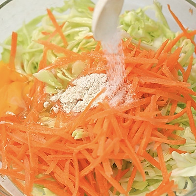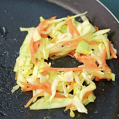 步骤9、平底锅刷油,放入蔬菜馅,中间挖一个小洞