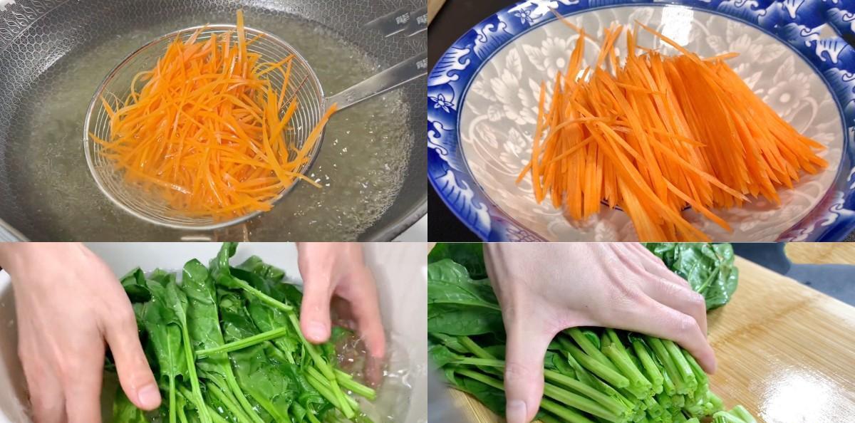 所需食材:菠菜 鸡蛋 胡萝卜 葱姜蒜 辣椒 淀粉