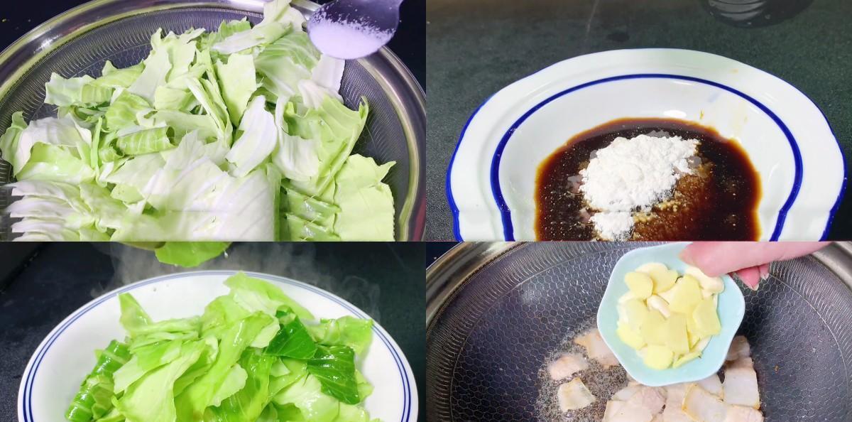 7、锅中再次烧油 放入五花肉改炒一炒,小火慢炒,煸炒出里面的油脂 ,然后再放入葱姜蒜爆香,然后再放入香菇片继续炒,炒入味 再放入炒好的包菜 再倒入弄好的料汁