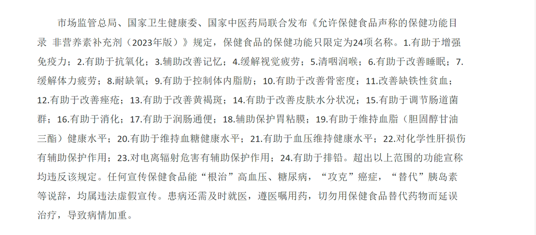 市场监管总局、国家卫生健康委、国家中医药局联合发布《允许保健食品声称的保健功能目录 非营养素补充剂(2023年版)》规定,保健食品的保健功能只限定为24项名称。1.有助于增强免疫力;2.有助于抗氧化;3.辅助改善记忆;4.缓解视觉疲劳;5.清咽润喉;6.有助于改善睡眠;7.缓解体力疲劳;8.耐缺氧;9.有助于控制体内脂肪;10.有助于改善骨密度;11.改善缺铁性贫血;12.有助于改善痤疮;13.有助于改善黄褐斑;14.有助于改善皮肤水分状况;15.有助于调节肠道菌群;16.有助于消化;17.有助于润肠通便;18.辅助保护胃粘膜;19.有助于维持血脂(胆固醇甘油三酯)健康水平;20.有助于维持血糖健康水平;21.有助于血压维持健康水平;22.对化学性肝损伤有辅助保护作用;23.对电离辐射危害有辅助保护作用;24.有助于排铅。超出以上范围的功能宣称均违反该规定。任何宣传保健食品能“根治”高血压、糖尿病,“攻克”癌症,“替代”胰岛素等说辞,均属违法虚假宣传。患病还需及时就医,遵医嘱用药,切勿用保健食品替代药物而延误治疗,导致病情加重。