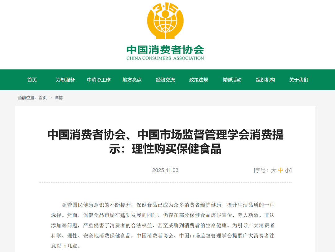 11月3日,中消协官网显示,中消协、中国市场监督管理学会发布消费提示:理性购买保健食品,提醒消费者注意以下三点:保健食品不是药品,不能替代药物治疗;明辨真伪,科学选购;保留消费凭证、维护自身权益。任何宣传保健食品能“根治”高血压、糖尿病,“攻克”癌症,“替代”胰岛素等说辞,均属违法虚假宣传。
