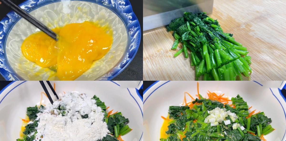 所需食材:菠菜 鸡蛋 胡萝卜 葱姜蒜 辣椒 淀粉