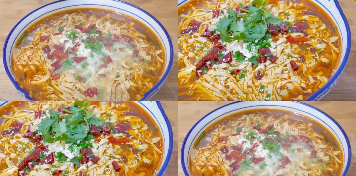 8、接下来往里面放入葱姜蒜末 再放入辣椒段 然后放入葱花 浇入热油 激发出香味,美味好吃的水煮豆腐皮就做好了。