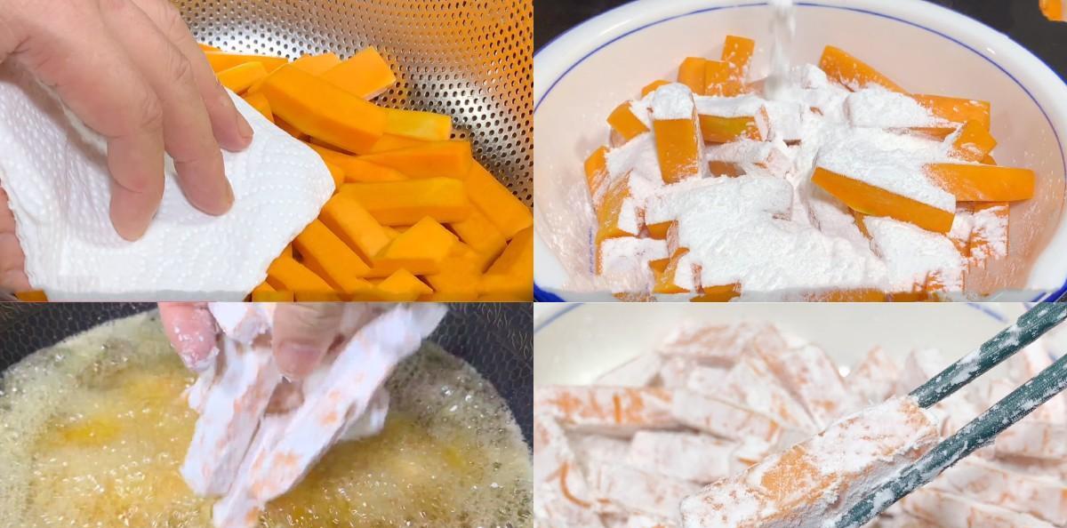 入味,然后再给南瓜捞出,放进凉水里面清洗一下,多清洗几遍,然后再给南瓜控水,或者是用吸水纸擦干水分