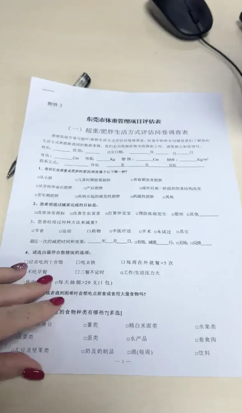 在门诊测量血压后,欧阳做了一份调查问卷,约15个问题,涉及平常的饮食习惯、偏爱的食物、曾经尝试的减肥方法、倾向的运动等等。走进诊室后,医生详细询问了她的月经情况、身体是否不舒服等,给她做了进一步的身体检查。